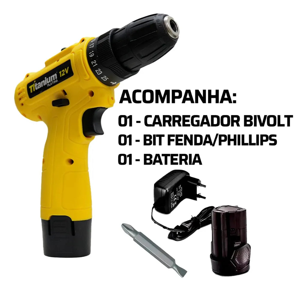 Seja para uso profissional ou doméstico, a Parafusadeira e furadeira Titanium com mandril 3/8, é a ferramenta ideal para quem busca versatilidade e praticidade.Por sua dupla funcionalidade, sendo furadeira para superfícies como alvenaria, metal, madeira e plástico, além da função parafusadeira, facilitando parafusar e desparafusar, dando mais rapidez ao processo. Carregador bivolt para facilitar o uso em qualquer local. Conta com velocidade variável e seletor de reversão, facilitando a troca de sentido de rotação. Seu tamanho e design facilita o uso e fornece uma empunhadura mais firme. Além da maleta organizadora